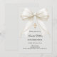 Bjud in gästerna med denna sofistikerade konfirmationsinbjudan. Designen har en lyxig elfenbensfärgad satängslinga draperad med ömtåliga pärlor och ett skinande guldkors mot en mjuk duvgrå bakgrund. Det är ett vackert val för en ung flicka som firar sin konfirmation.