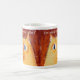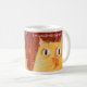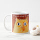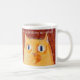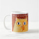 Tecknaden målad katt med vitcirkuläret synar. Målat löst i orangar och gulnar på en röd bakgrund som en closeupbyst, katten som ansikte är framstående. Ovanför katten är texten, "är dig som dricker mitt kaffe?".