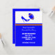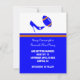 Roligt fotbollstema för brölloppsinbjudan "Save the Date" gjort i kunglig blå, orange och vit. Grafik med en kunglig blå stiletthög klack som sparkar en kunglig blå och orange fotboll pryder den övre vita delen av kortet. Den nedre delen av kortet är gjort i kunglig blå med en orange rand nära toppen och anpassad vit text som är redo att anpassas med din bröllopsinformation. Baksidan är kunglig blå med orange text som löper i sidled och läser "Save The Date". Bra "Save The Date"-inbjudningar för det fotbollsälskande paret.