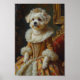 Ett elegant kungligt porträtt som visar Coton de Tulear som en graciös ö-prinsessa. Inspirerad av klassiska europeiska oljemålningar, framhäver designen rasens mjuka, fluffiga päls med lyxig kunglig klädsel och en delikat juvelbesatt tiara.