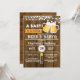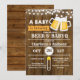 Rustik träbakgrund med tema öl och grill, inbjudan till babyboy shower.