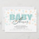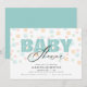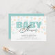 Denna bebisdump-inbjudan är perfekt för både en babypojke och en babyflicka. Denna könsneutrala design erbjuder en modern minimalistisk look med ordet "baby" i ljust turkos och bakgrunden är ett prickmönster i mjuka pastellfärger.