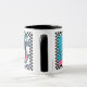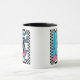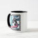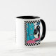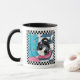 Denna muggdesign presenterar en smokingkatt som vilar hans huvud på hans ägarefotstunder som hon gör frukosten. Avbilda omges av en svartvit kontrollerad gräns och syns på båda sidor av muggen. Ta copyrightt på © Lisa Marie Robinson. All reserverad rättigheter.