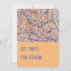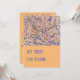 Bild av en abstrakt målning på persikofärgad bakgrund på framsidan med festdetaljer på baksidan.