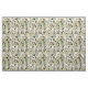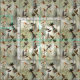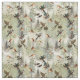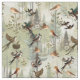 En underbar fantasi illustrerar i ett modernt stil en fågelfamilj mellan olika höga, lätta, medelstora och mörk grönt träd, med en grå bakgrund och blommor.