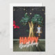 En magiskt surrealistisk födelsedag med vintage stjärngarland och brunettflicka i svängklippor...den överdimensionerade rödfjärilen, den gyllene bottennoten träd och texten "Grattis på födelsedagen" på lax och vit neon.