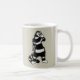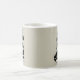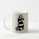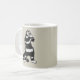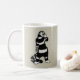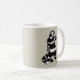 Katt mugg med en bläck teckning som skildrar ett märkligt svart och vitt strippat kattunge med lång nacke som håller en skallmask. En av hans handskar verkar vara ute och hans skeletthanddukar visar från sin sleeve. Jag undrar om det är mycket mer av en läskig varelse än det låtsas vara på Halloween.