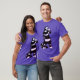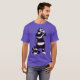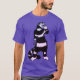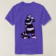Kattens lila-skräckskjorta med en bläck-teckning som skildrar ett märkligt svart och vitt strimlat kattunge med lång nacke som håller en skallmask. En av hans handskar verkar vara ute och hans skeletthanddukar visar från sin sleeve. Jag undrar om det är mycket mer av en läskig varelse än det låtsas vara på Halloween.