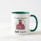 En mugg för konstlärare som presenterar logotypen av den rosa schoolhousen som omges av rosor, gult, grönt och svarten, målar splatters. Text läser "världsmästarekonstlärare.", Många storleksanpassar och utformar för att välja från. Underbar gåva för din favorit- konstlärare! Fyll den med godisen, eller tillförsel liksom målar borstar, kritor, eller teckningen ritar!