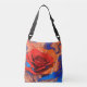 Konstnärliga och moderna korsar väskor AI genererade digital abstrakt marmorerad och orange ro i fullt blomning på blå bakgrund.