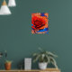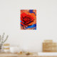 Konstnärlig och modern blommigt poster funktioner som AI genererade digitalt abstrakt som marmorerats rött och orange ro på blå bakgrund.