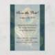 Fira din bröllopsdag med en konstnärlig och unik påfågels tema med detta vackra "spara datumet" bröllop postkort och matchande tillbehörsset. Har snygg, rik och lyxig konst av en påfågel fjäder detalj i färger av koboltblått, turkos och celadon ljusgrönt. Bakgrund i mörkt akvamarinblått med en antikkänsla och virvlande design. © 2010 www.CustomInvitesOnline.com
