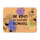Vi presenterar en enastående magnet-anpassningsbar som visar den inspirerande frasen "BE TYP TILL DIG SJÄLV". ALLTID." Citatet är elegant skrivet i ett tryckt svart teckensnitt, kontrasterat mot en pulserande bakgrund som läggs till med konstnärliga lilor och gult-färgstänkar och penseldrag. Om du vill framhäva mönstret ytterligare, utsmyckar handritade blommor med känsliga svarta konturer bildligt sammansättningen, mot en mjuk bakgrund av mjuk orange.