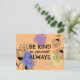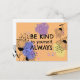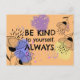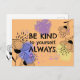 Vi presenterar en enastående vykortsdesign med anpassningsbarna: "BE TYP TILL DIG SJÄLV. ALLTID." Citatet är elegant skrivet i ett tryckt svart teckensnitt, kontrasterat mot en pulserande bakgrund som läggs till med konstnärliga lilor och gult-färgstänkar och penseldrag. Om du vill framhäva mönstret ytterligare, utsmyckar handritade blommor med känsliga svarta konturer bildligt sammansättningen, mot en mjuk bakgrund av mjuk orange.