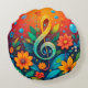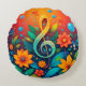 Konstnärlig musiknot omgiven av färgglada blommor rund kudde