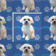 Cute Artistic stil Maltese hund mot blå bakgrund med tass avtryck och spår i grått. rosa och blått. Originalfotot ändrades till ge till ett målat utseende.