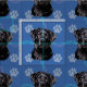 Konstgjord digital stil-målning av huvudet på en svart Labrador Retriever mot blå bakgrund med tass avtryck och spår i grått, blått och rosa.