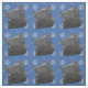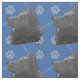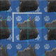En konstnärlig sketch stil-återgivning av chefen för en Schipperke-hund mot en blå bakgrund med tass avtryck och spår i grått, rosa och blått.