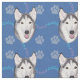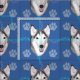En söt konstnärlig återgivning av huvudet på en Husky mot en blå bakgrund med tass avtryck och spår i grått, blått och rosa.
