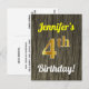 Denna enkla och anpassningsbara födelsedagstema-postkortsdesign har ett anpassningsbart meddelande som "Jennifer's 4-årsdag!" på framsidan, där namnet kan ändras, och där "4" har ett utseende som liknar guld. Framsidan har också en bakgrund som ser ut som trä. Baksidan har ett personligt meddelande och en anpassad mottagaradress. Meddelandet och/eller mottagaradressen kan lämnas tom om de ska fyllas i för hand. Det kan skickas som en hälsning till någon som firar sin fjärde födelsedag, eller så kan postkort som dessa användas som inbjudningar när man bjuder in gäster till en fest som hålls för att fira någons fyraårsdag.
