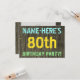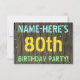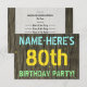 Den här roliga födelsedagsinbjudan har ett meddelande på framsidan som exempelvis "NAMN-HÄR fyller 80 år!", där namnet kan anpassas. Bakgrunden har ett rustikt, brunt, falskt trästrukturmönster. Den anpassningsbara texten på framsidan har färger som blå, gul och grön och har ett utseende inspirerat av målad, schablonmålad text. Baksidan har ett anpassat meddelande som kan innehålla viktig information om födelsedagsfesten, till exempel datum och plats, tillsammans med annan relevant information. Födelsedagsinbjudningar som denna kan vara ett roligt sätt att inbjuda familj och vänner till en födelsedagsfest för någon som ska fylla 80 år.