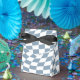 Moderna bröllopsfester för temat Dusty Blue färg. Varje grönt trendig varnade för utformningen, skevt pappert tallrikar i vacker elegant och chic Dusty Blue och white färg.