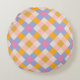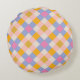 En stil-rund kudde med söta checkar, i ljust violett, nyp och gult.