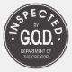 Sticker säger "INSPECTED BY G.O.D., Department of the Creator"