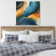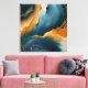 Denna raffinerade abstrakta konstverk fångar den tysta lyxen av flytande rörelse, där djupa havsblå möter smält guld i en långsam, elegant dans. Smidiga, flödande former krusar över kompositionen som polerad sten, flytande metall eller undervattensströmmar, och skapar en känsla av djup och naturlig harmoni. De gyllene accenterna framstår som organiskt inbäddade i de blå tonerna, och tillför varmt, rikedom och en subtil känsla av överflöd.
