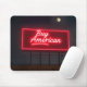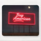 Ett stort rödneontecken med orden "Köp amerikanskt" glöder lätt mot natt himmel, med fullt måne synligt ovanför