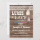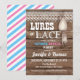 Köper eller spets könsbestämning design med lantlig träbakgrundsfiske lock och spets grafik.