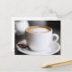 kopp i kaffelatte på bord, närliggande vykort
