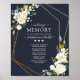 Modern och trendig, denna bröllopstavla "i kärleksfull minne" har en falsk koppargeometri dekorerad med akvarell vita blommor och eucalyptusgrönska blomsterarrangemang över en modern marinblå textur. Del av en matchande kollektion. Se hela kollektionen här: https://www.zazzle.com/collections/copper_geometric_white_blue_elegant_floral_wedding-119426320773611020 Copyright Elegant Invites, alla rättigheter förbehållna.