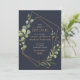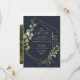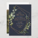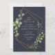 Den här söt bröllop spara datum-kortsdesignen är modern och trendig och har en ytlig koppargeometri som är förskönad med vattenfärgen eukalyptus greenery, över en marin blå bakgrund. Kortets baksida innehåller ditt favoritfoto på förlovningen. En del av en matchande bröllop-svit. Copyright Elegant Inbjudan, alla höger reserverade.