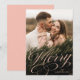 Kort för helgdag av elegant med lodräts foto med "Merry" som visas i en övertäckning av ett calligraphy-skript för rosa. Anpassa framsidan av calligraphy-skriptkortet genom att lägga till helgdag nedan. Helgdag återgår till ett subtilt, vitt mönster snö med rosa.