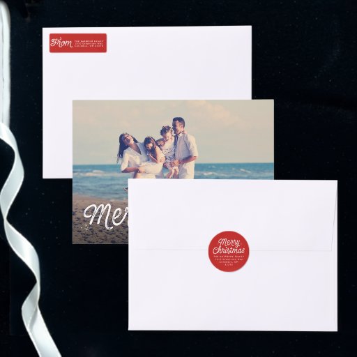 Ett sött skript "från" omgivet av stjärnor gör att en god koordinerande returadressetikett kan paras med Lea Delaveris Design's Merry Script helgdag-fotokort. Bakgrunden färg är marin blå, men det går att redigera genom att klicka på "anpassa".