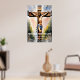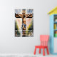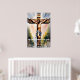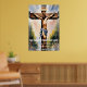 Kor är ett bevis på att kärlek kan vara tillräckligt starkt för att bära världshaven. Jesus med vågigt hår och skägg, tittar uppåt med ett tänkvärt uttryck. Han har ett sår på pannan och det finns ett rött märke som liknar ett kor på hans hud. Han bär en vit trasa som är skrapad över sina axlar, och ett kedjehalsband syns runt hans nacke. Bakgrunden visar en kor av trä med röda rep och himlar ovan är grumlig.