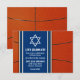 Inbjudan till Bar Mitsva-firande med basketbolltema med orange basketbollbakgrund och blåa accenter i form av basketbollströjor. Detta inbjudningskort till Bar Mitsva-firande med basketbolltema är stilrent och modernt. Detta inbjudningskort till Bar Mitsva med basketbolltema har en orange basketbollbakgrund med en judisk Davidstjärna och blåa accenter. Färgerna i denna Bar Mitsva-design med basketbolltema är orange, blå, vit och svart.