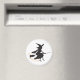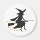 En silhuett av en häxa på en bom med ord i orangen "Ja, jag kan köra en pinne."
