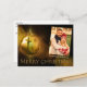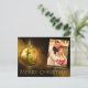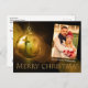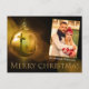 En modern kristen julkortsdesign med ditt familjefoto och namn ovanför ett glimmerande glimmerande guld God jul bredvid en guld-julprydnad med en reflektion över Kristus kor. Du kan anpassa hälsning, returadressen och namn i manuset nära grund med plats för att lägga till en personlig anteckning.