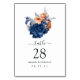 Koral - Rustik persika och marin blått vattenfärgskort i bröllop med bordsnummer med faux foil silver foliage designat för att snabbt och enkelt kunna anpassas till dina händelsespecifikationer.