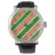 Den här klockan med korall och grönt diagonalt rand gör ett djärvt mode påstående.