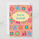 Inbjudan ett quilter eller quilt älskare med den här färgfulla, fullmatade anpassadet quilt-inbjudan. Anpassa helt och hållet på framsidan och baksidan för att lägga till egna ord, namn och annan information. Den här originalfiguren ger en livfull inbjudan. Kvinnografik som bygger på originalkonst har favoritlappar av lapptäcke plus unika block i vibrerande och dynamiskt färger av orange, gult, rosa, turkos och kalkgrönt på en korallbakgrund för en vacker färg-palett. En solig gult oval står på kortets framsida för att säga "Du är inbjuden" eller annat ord du själv väljer. Visa kärlek för att du ska kunna klämma med de här konsformade designerna med andra konsthantverk. Quilt art är originalkonst från tyg och formgivare Phyllis Dobbs och finns i en textilsamling från Quilting Treasures. Den här konsten finns på andra produkter och i flera färg-miljöer. Fler produkter finns tillgängliga i Phyllis Business withFlair-butiken. Matcha med samordning av frimärke, kuvert, klistermärken och returetiketter.