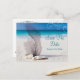 Den här romantiska designen har ett foto av en vit sandstrand med havet i vackra blå nyanser. Coral är konstgjort arrangerad med kontrollceller. Swirls är inspirerad av vågarna i vatten. Anpassa det här vykortet med information om det kommande bröllop. Dessa är underbara för strandtema eller destinationsbröllop.