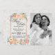 Korall, orange, rosa och teal vattenfärgblommor och falskt roseguld-kontur, Spara datum-bröllopskort. Denna klassiska och sofistikerade design är perfekt för det trendiga och stiliga paret som gifter sig. Personifiera med ditt eget meddelande på framsidan samt en anpassad monogram-initial på baksidan. Allt foto-utskriftsdesign.