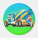 Ett gult och gult-strimlat betongblandarmärke, ett stort byggmärke lastbil.
