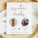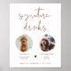 Denna signaturdrycksskylt har två fotoramar, en kantig handskriven stil och en modern minimalistisk design samt en boho rost och vit färgskala. Ändra enkelt typsnitt och bakgrundsfärg för att matcha din händelse. Denna skylt är perfekt för att lägga till antingen ett foto av bruden och brudgummen, ungarna eller dina favorithusdjur.