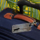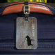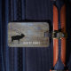 Manligt personligbagagemärkre med fotobakgrund av gammalt bekymrat wood korn. Som sett horisontellt, har grund att skugga av älg med hans horn på kronhjort som står bredvid personlignamn i kraftfullen, stämplad lookbokstäver. Baksida har samma gammal wood lookbakgrund med den beställnings- textmallen för adress och telefonnummer eller annan information om kontakt. Ojämnt och manly, är denna den perfekta lantliga bagagemärkren som är för manar eller för naturälskare, speciellt för jägare.