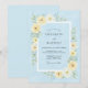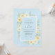 Denna design har en mjuk kornblå bakgrund prydd med ett delikat akvarellarrangemang av smörgula rosor och krämvita dahlior. Frodig salvia-grönska och eteriska botaniska kvistar skapar en lugn atmosfär perfekt för ett romantiskt vår- eller sommarfirande. Paletten blandar svala pastelltoner med varma blommiga accenter för att framkalla en känsla av tidlös elegans och naturlig skönhet.
