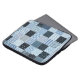 Kort design. Sömlöst lappverk mönster från sydda fyrkanter med olika geometriska dekorationer. Textilutskrift i blå färg.